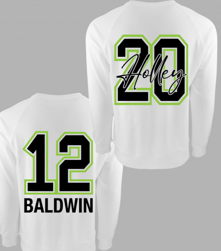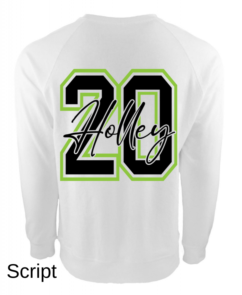 Type in your players last name, number and select font style (block or script) for a total custom back of sweatshirt. (Please double check – what you type will be printed exactly as you enter it!)